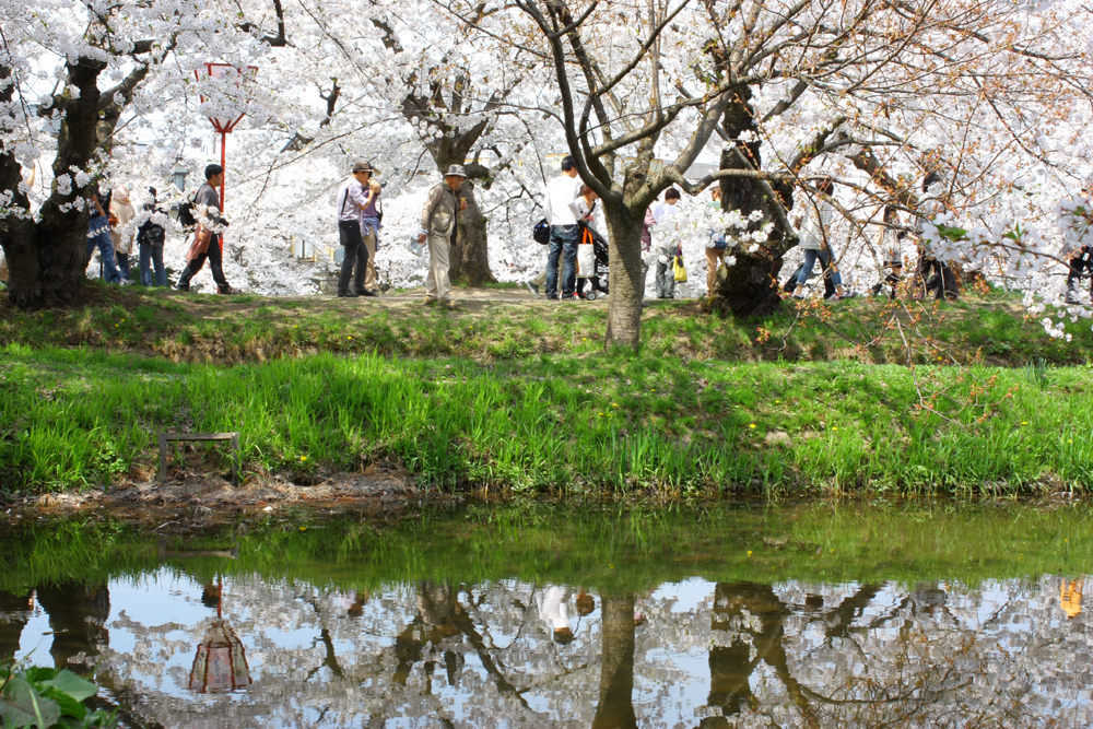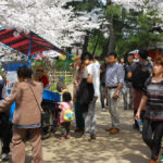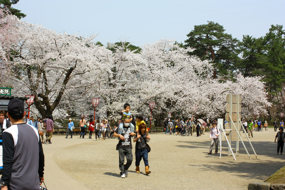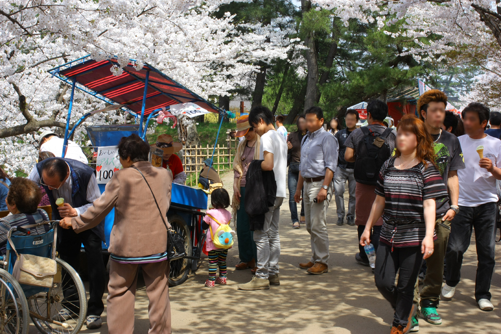 12時過ぎ頃には観光客や地元の人で園内至るところで花見を楽しんでいました。 四の丸は大勢の花見客がゴザやブルーシートを敷いて宴会を開き、日影では年配の方々が涼んでいたり、皆、思い思いにさくらまつりを満喫していました。